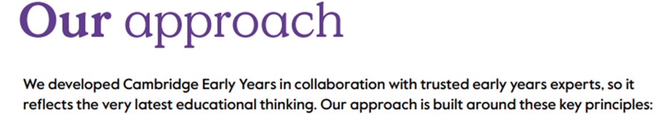 - It offers everything you need for high-quality learning: a holistic, balanced curriculum, engaging classroom resources, professional development and assessment approaches to help you measure your learners' progress. We believe that Cambridge Early Years works best when you use all elements of the programme together.
